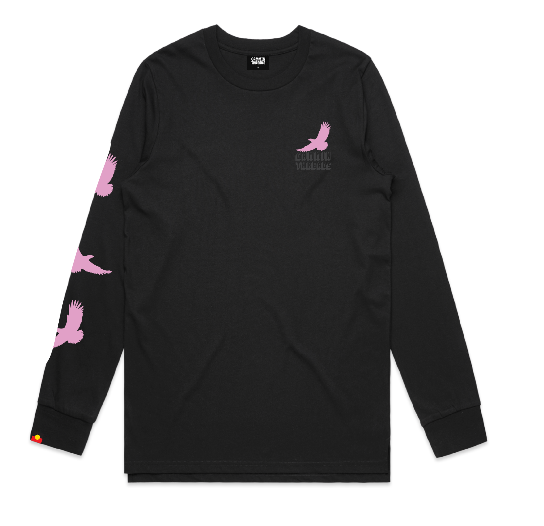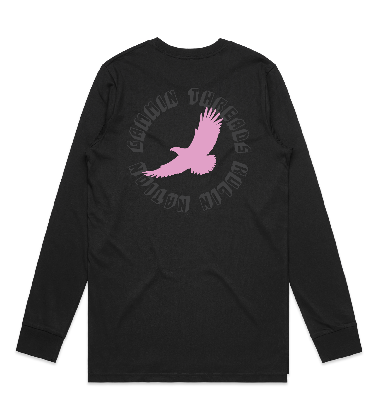 Gammin threads is a proud Kulin Nation brand. One of our totems is Bunjil the eagle. Features lilac print eagles with contrast gloss black text. This is a heavy weight, soft combed cotton jersey long sleeve tee in a standard mens fit.