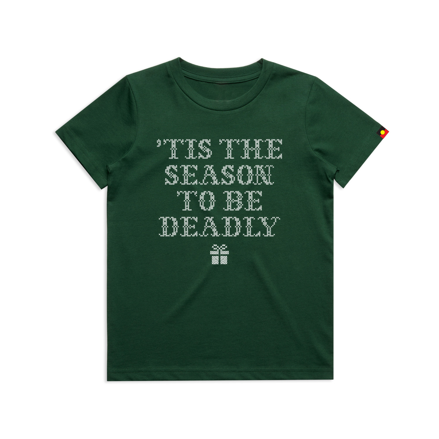 Level up your jarjums Christmas wardrobe with a tee that celebrates culture, joy and festive spirit in one bold moment. Our “’tis the season to be deadly” tee features a crisp cross-stitch–inspired typeface that feels both nostalgic and fresh - available in classic Christmas red or a rich green.