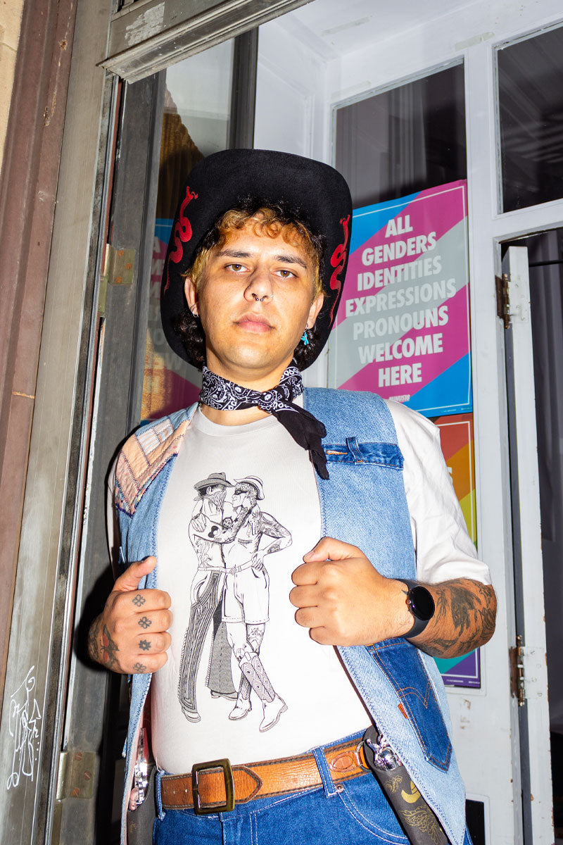 Drawing inspiration from the iconic Vivienne Westwood's cowboy tee, this design is a celebration of blak queer culture, expression, resilience and joy of the blak LGBTQIA+ community.