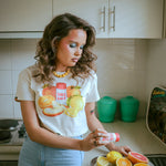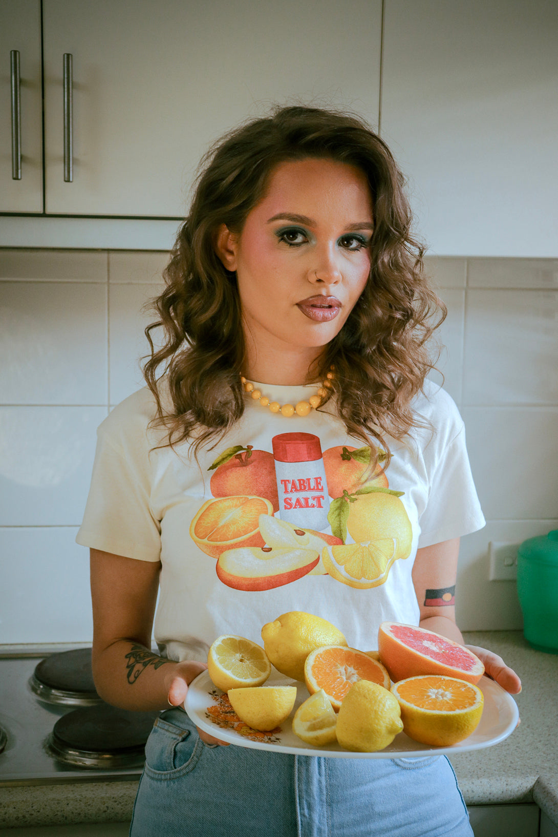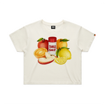 The taste of summer, this lightweight women's crop features print of summer fruits and the classic table salt, with the Aboriginal flag pip tag on sleeve.